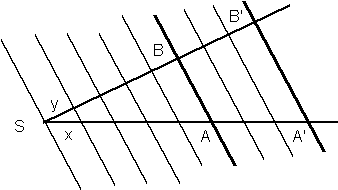 Wir denken uns jetzt nach jedem Anlegen von x eine Parallele zu den beiden Ausgangs-Parallelen. Der Sonderfall sagt, dass bei zweimaligem Anlegen auch aus dem zweiten Strahl gleich lange Strecken (der Länge y) ausgeschnitten werden. Indem man den Beweisgedanken des Sonderfalls fortsetzt, folgt , dass alle ausgeschnittenen Abschnitte auf dem zweiten Strahl die Länge y haben. Folglich gilt ïSBï : ïSB'ï = m : n, also ïSBï : ïSB'ï = ïSAï : ïSA'ï , w.z.b.w..