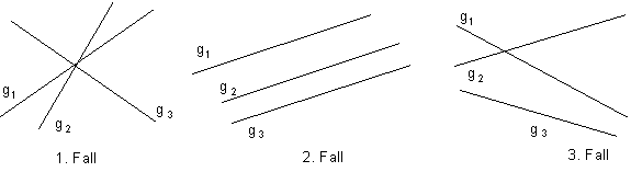 3. Fall: g1 und g2 schneiden sich im Punkt P, g2 und g3 nicht.